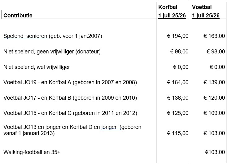 De geldende prijsindex in juni 2025 bedraagt 133,96 tegenover 129,91 in juni 2024. (Uitgangspunt CPI alle huishoudens 2015 = 100). De contributie voetbal geldt als basis voor de aanpassing en is in alle leeftijdsgroepen t.o.v. 2024-2025 verhoogd met de index van 133,96/129,91.